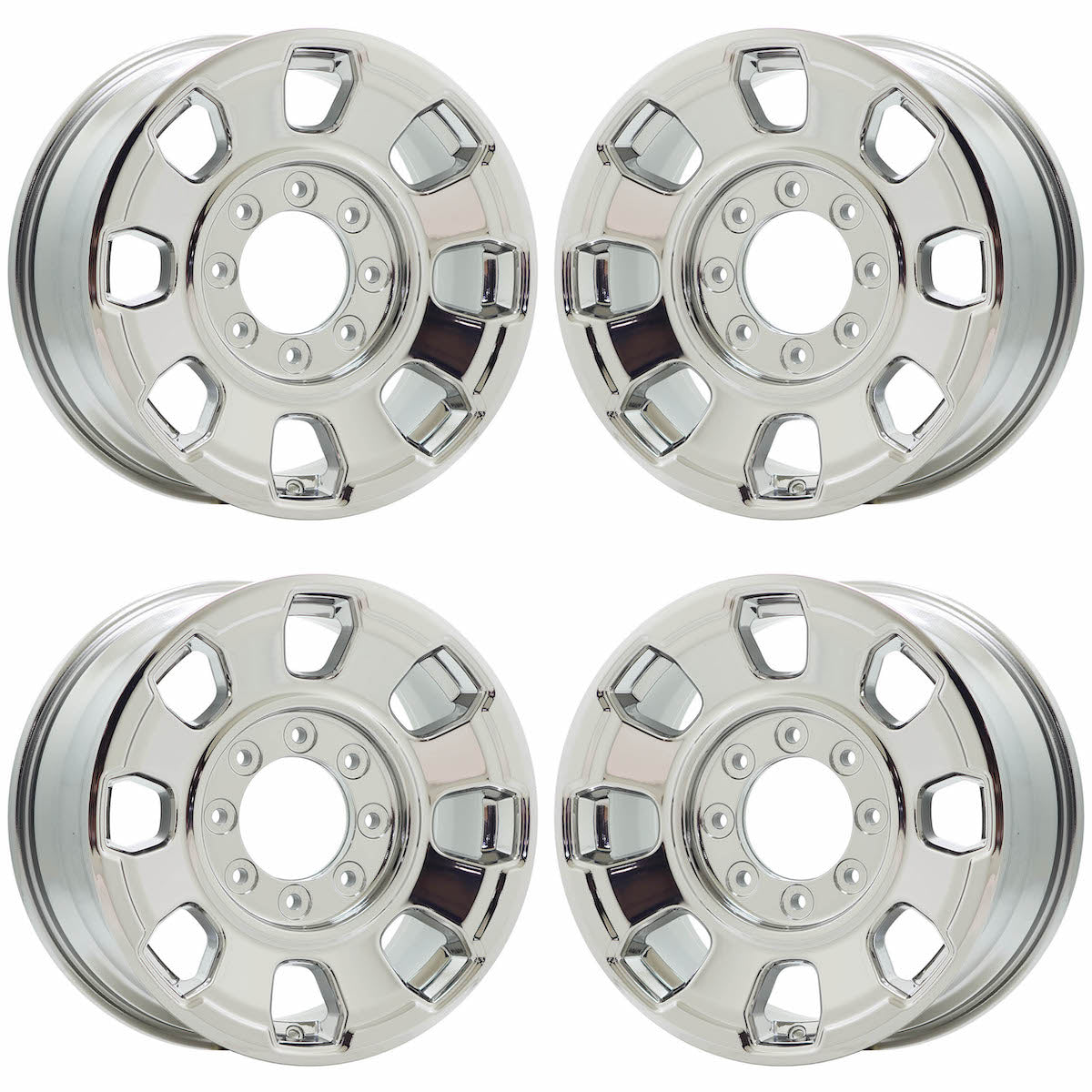 Set of (4) 18x8" Ford F-250, F350 PVD Chrome Factory OEM wheelsThese are Factory OEM wheels that we strip and refinish in PVD Bright Chrome.Our coating...
